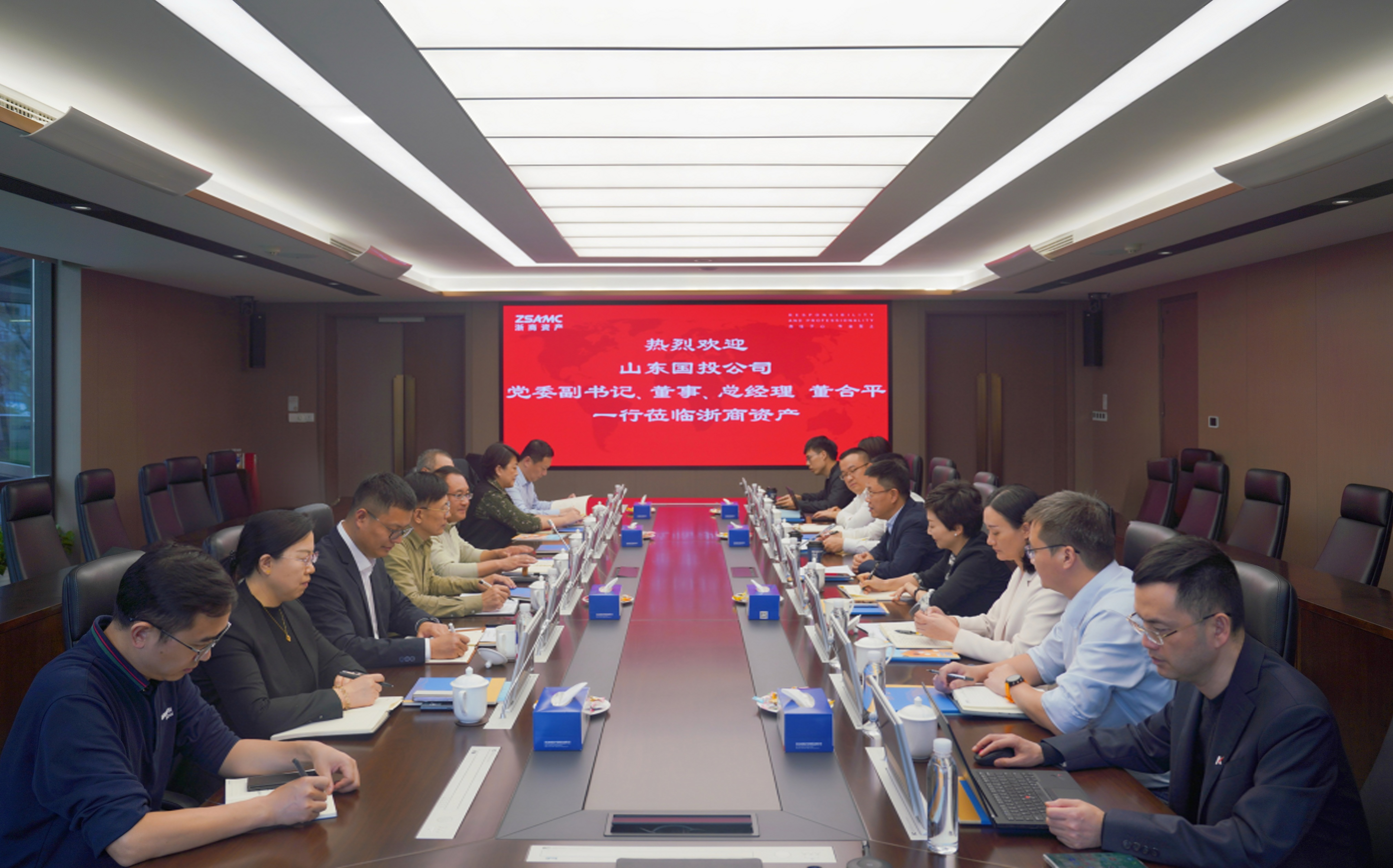 11月14日下午,山東省國(guó)有資產(chǎn)投資控股有限公司黨委副書記、董事、總經(jīng)理董合平等一行到浙商資產(chǎn)開展調(diào)研,浙江省國(guó)貿(mào)集團(tuán)黨委副書記、董事來濤,省國(guó)貿(mào)集團(tuán)黨委委員兼浙商資產(chǎn)黨委書記、董事長(zhǎng)應(yīng)春曉參加調(diào)研。省國(guó)貿(mào)集團(tuán)金融部及浙商資產(chǎn)相關(guān)領(lǐng)導(dǎo)、部門陪同參加。